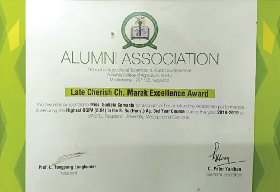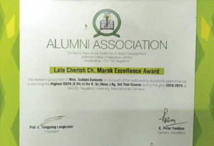 This award, sponsored by Smt. Thera Ch. Marak (8th Batch), is presented annually to the topper of the B.Sc. (Agri.) 3rd year. It carries a cash prize of Rs. 10,000 along with a certificate. To date, six students have been honored with the Late Cherish Ch. Marak Excellence Award.